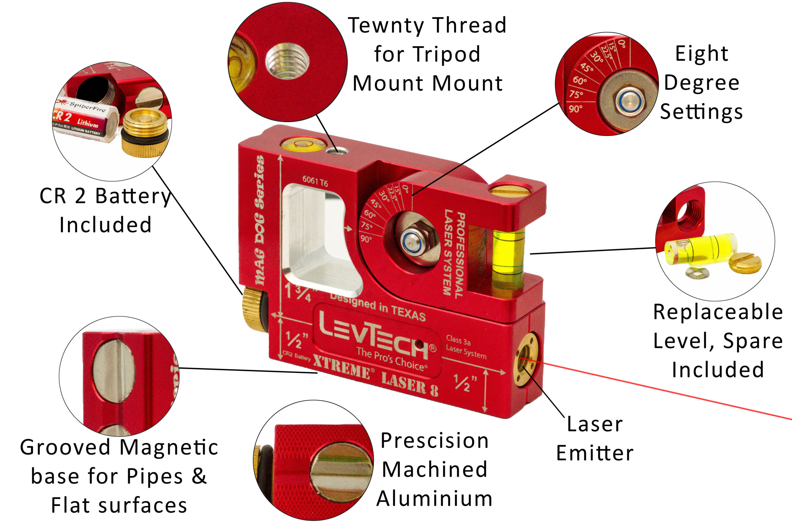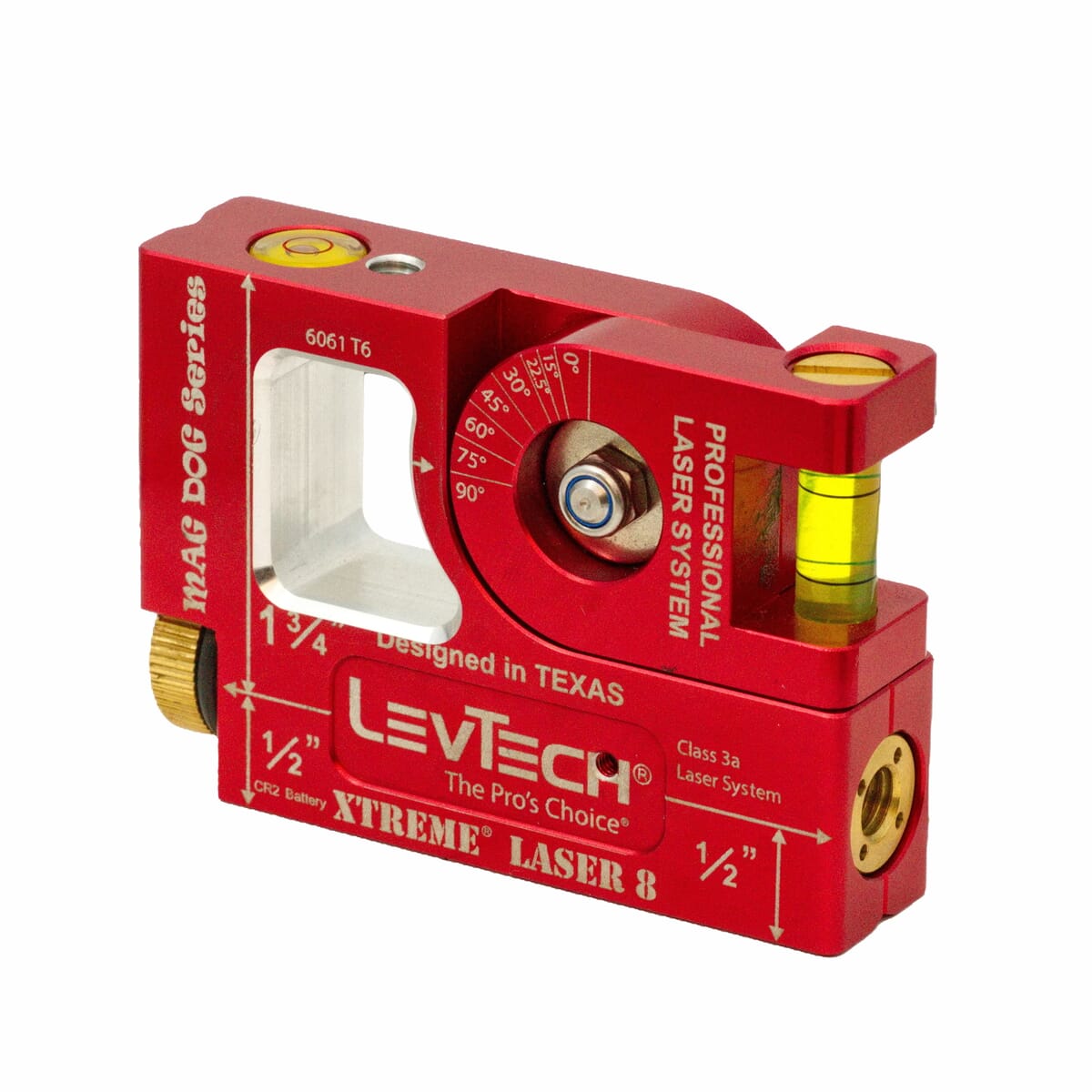 • Bullseye vial on top to ensure perfect x/y laser alignment