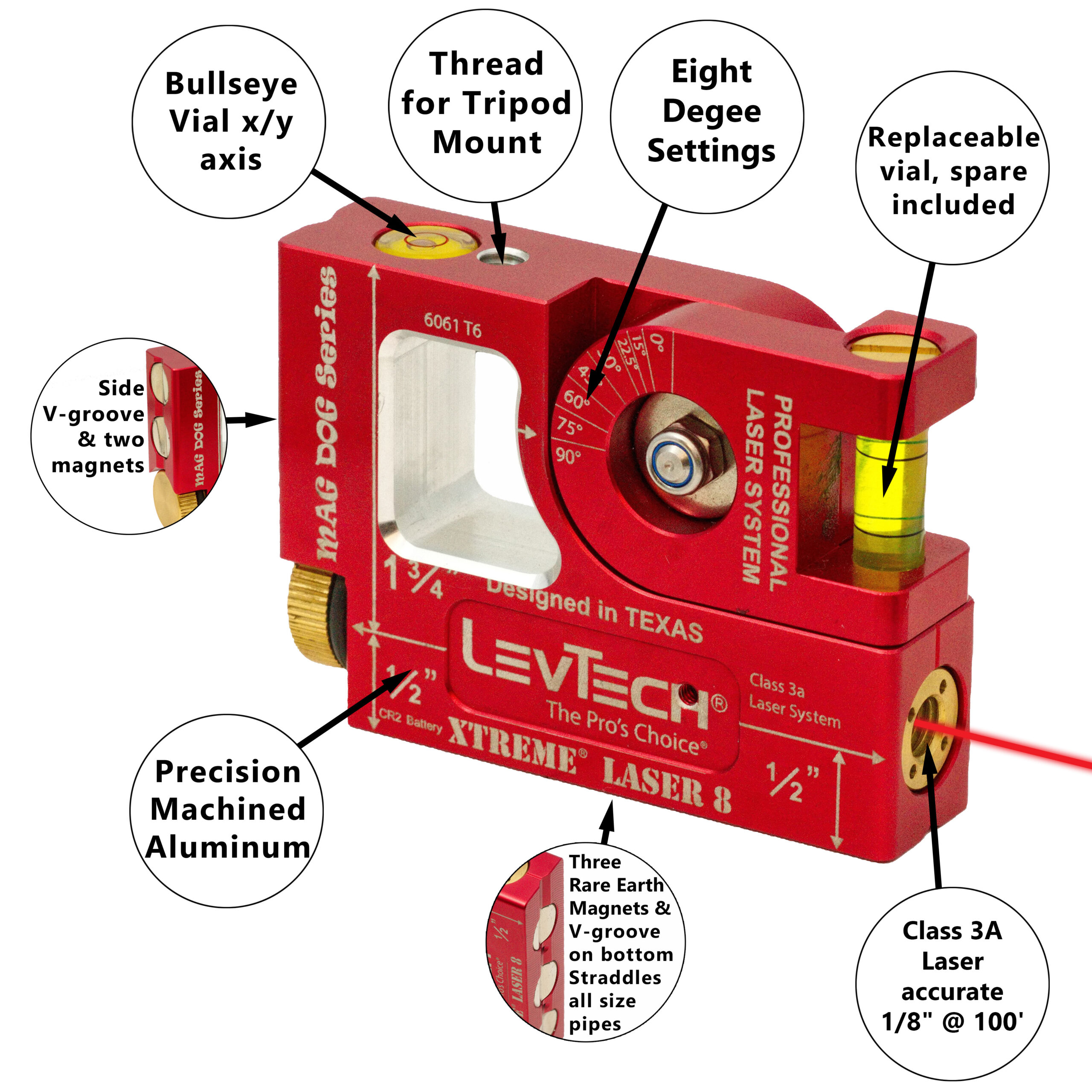 • V-Groove bottom with 3 XTREME® Rare Earth magnets to hold onto pipe
